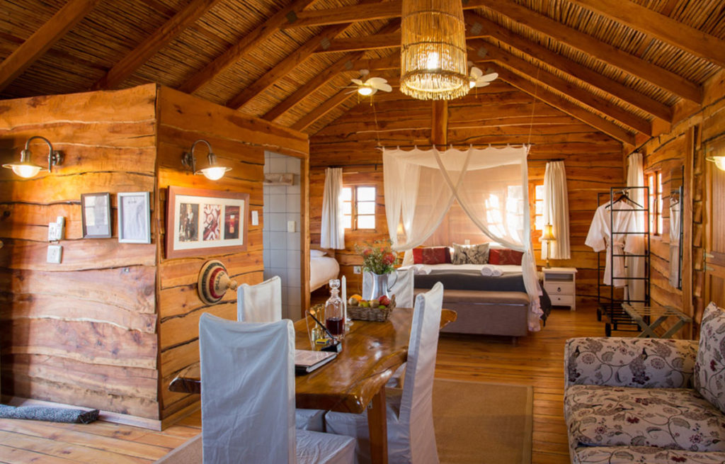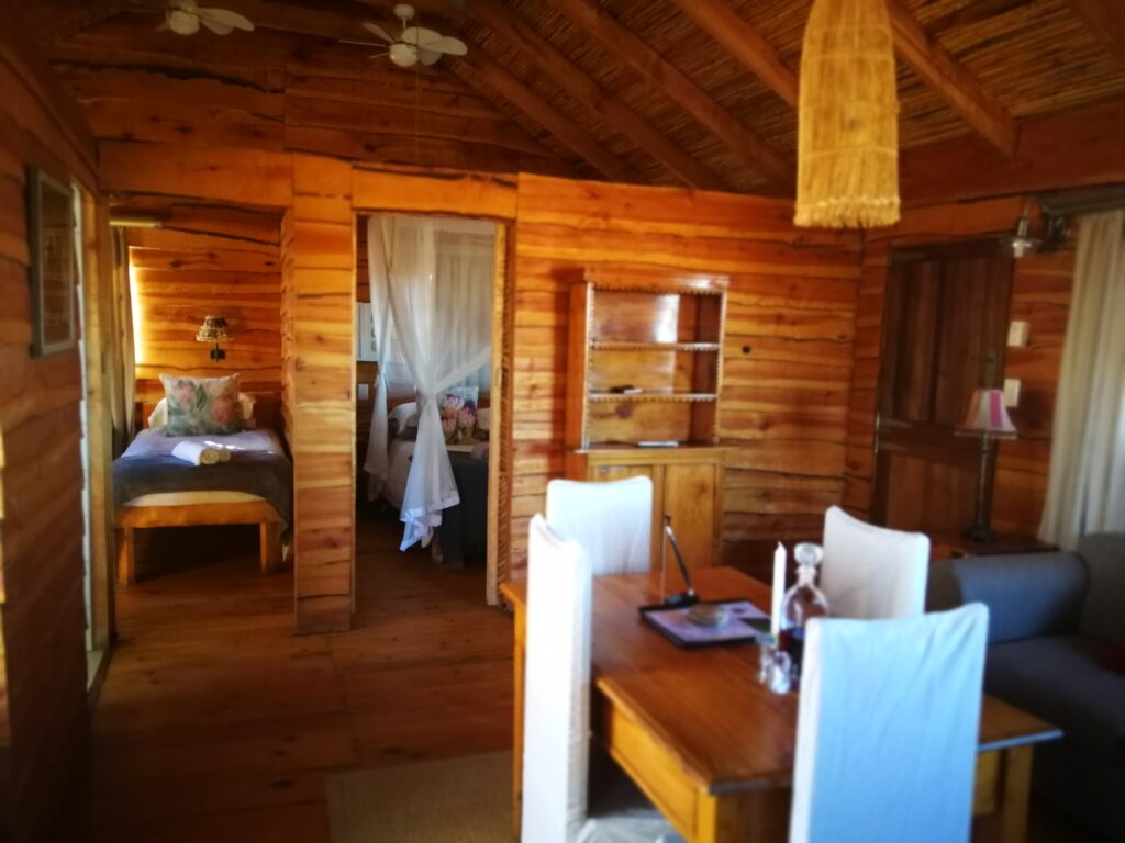 Unit has 2 bedrooms, wood partition walls, open at the top. Shower Only, Small kitchenette with microwave, fridge, two plate stove. braai options. Open plan kitchen and living area.
